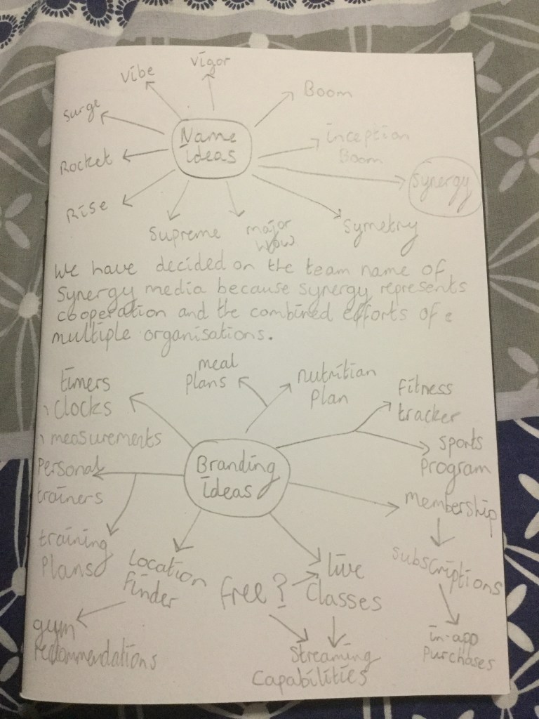 Represented below are the collated ideas for the group name we decided upon and the process of brain storming ideas for the product which we have decided will be sports based. We will be focusing on maintaining fitness and encompassing a variety of options and extras such as meal plans, nutritional information and a wide range of fitness programmes and classes.