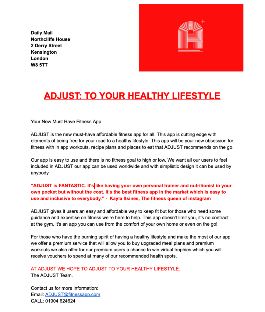 Below is our PR letter we wanted the best outcome for out app so we decided to sent press release letters to top newspapers and magazines to see if they are interested in doing an article or review on our app to boost our popularity. In the PR letter it sets our clearly what we want for out apps users and what we want our users to achieve for using our app.