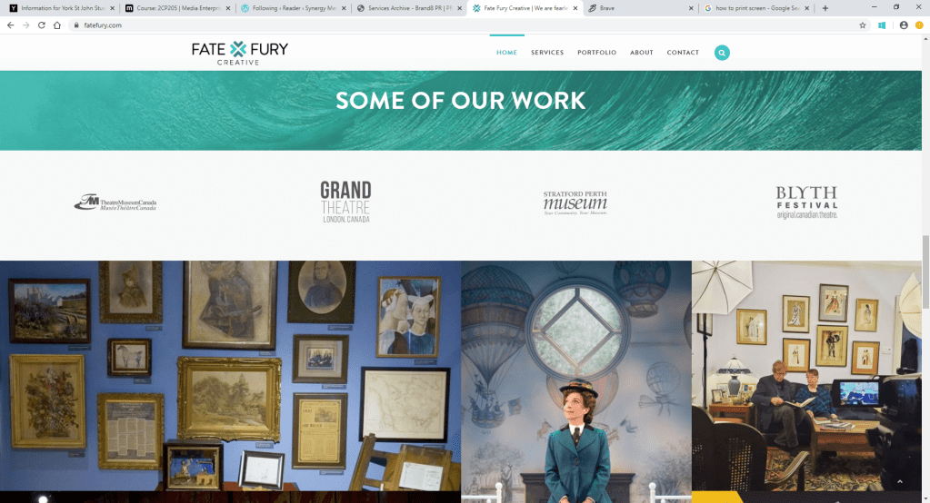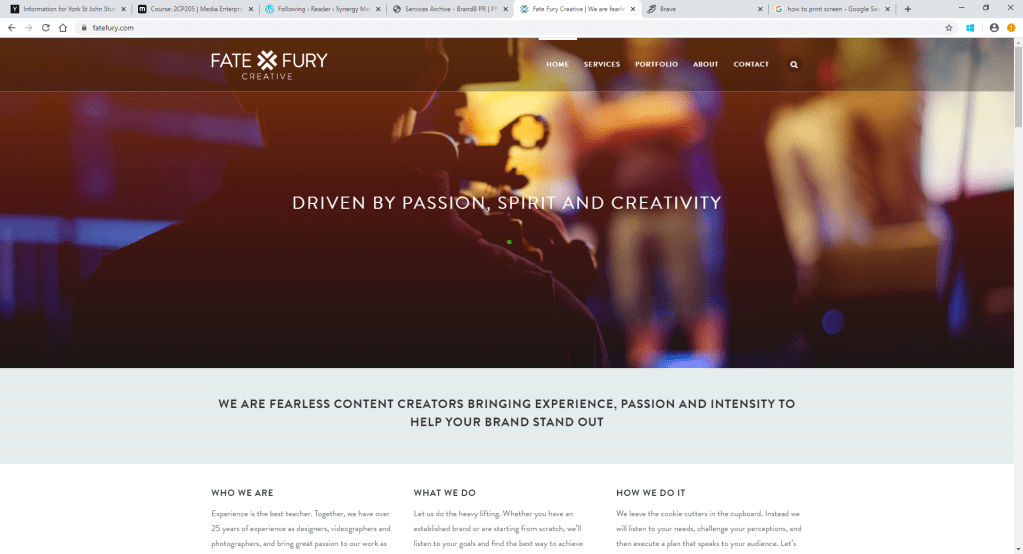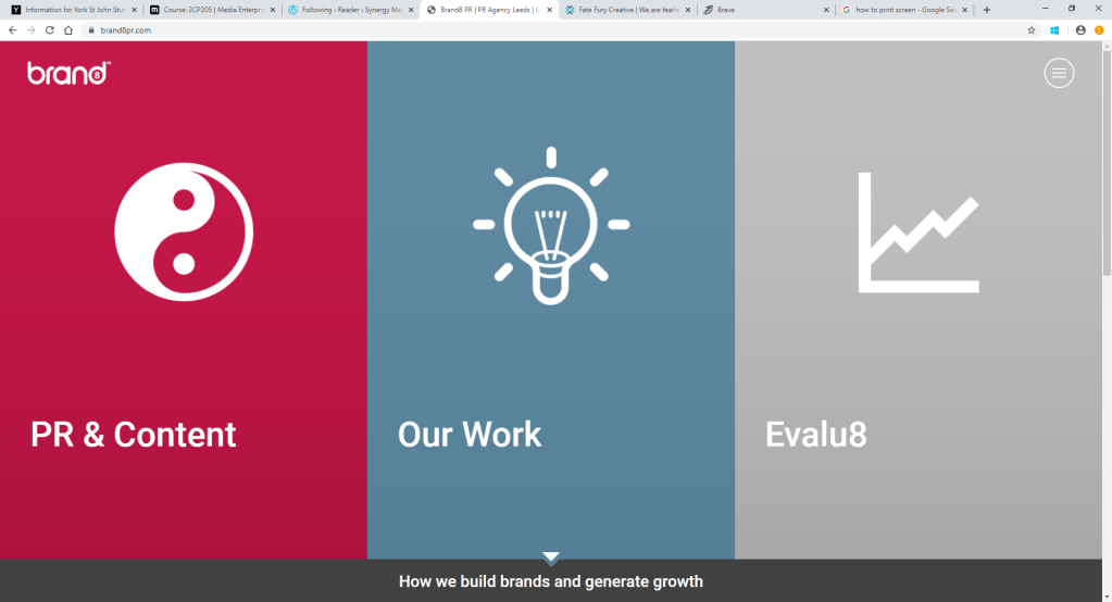As soon as we accessed the website, it wasn’t as obvious as to what the company was about. It was only until we read into the description that we learned, which suggests that Fate Fury isn’t as noticeable as Brand8 was. This could be implying that this company takes their approach to business more privately, rather than commercially. In terms of social media though, Fate Fury links every platform: Facebook, YouTube, Instagram and Twitter. Could this be implying that they need more social media platforms because they aren’t as well known within the branding industry? This does demonstrate an effective utilisation of social media. Out of all 3 branding companies, this is probably our least favourite as it doesn’t scream out ‘branding company’ until you read into yourself.