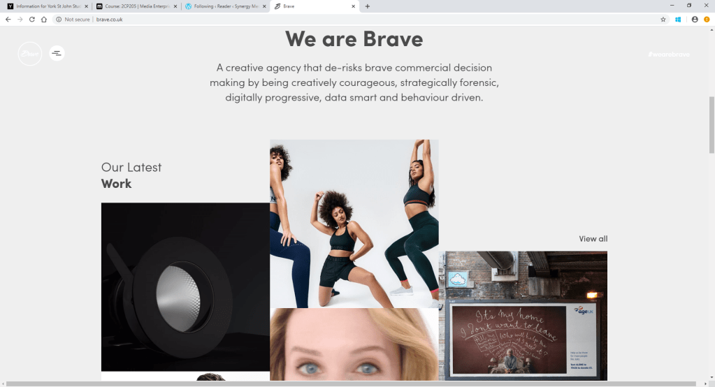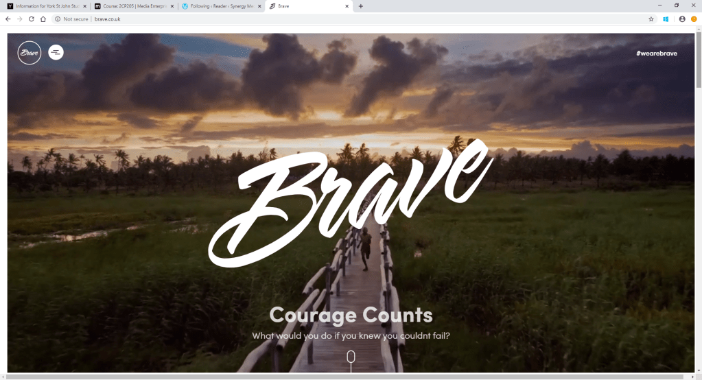 Brave clearly presents themselves an as interactive, animated branding company from the first look at the website. the first thing we see as customers is a promotional video which features multiple celebrity endorsements in it – such as Rio Ferdinand and Eyal Booker! This not only catches the eye of the market, but straight away demonstrates the companies skills and what the work that they have to offer us. Also, in the corner of the promo video, is the hashtag #wearebrave. the hashtag is alluding to the likes of Twitter, Instagram and Facebook that all use this is an advertisement. When scrolling down, Twitter, Instagram and LinkedIn are all inserted into the website, which shows that they have utilised social media through multiple ways on their website. This is definitely our favourite out of the 3, as it caught out attention the quickest, demonstrates strong branding skills through a portfolio and makes the business itself very clear.